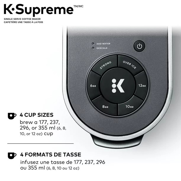 Whether you need a strong cup of joy to start your day, a refreshing iced coffee in the afternoon, or a smooth cup of decaf after dinner, the Keurig K- Supreme single serve coffee maker can handle it all. Boasting Multi stream Technology for enhanced flavour, it offers 4 different brew sizes and customized brew strengths for coffee that is personalized to your tastes.